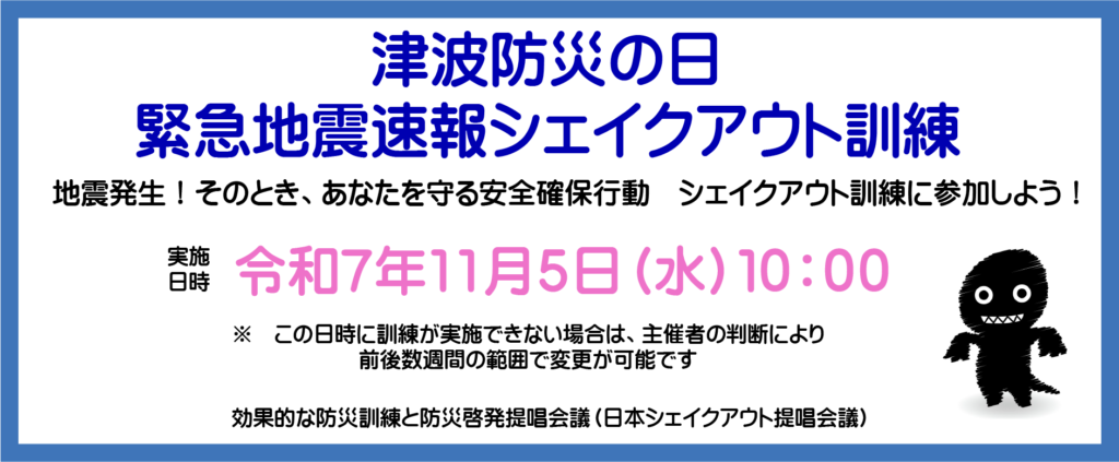 私たちは、内閣府、消防庁、気象庁が「津波防災の日」の一環として11月5日に予定している緊急地震速報訓練と連携したシェイクアウト訓練の実施をよびかけます。